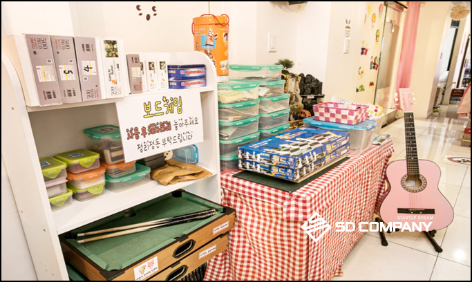 · 책/보드게임 등 놀거리가 준비되어 있으며, 룸안에는 TV시청도 가능