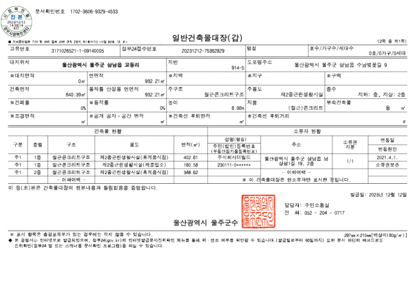 #뷰맛집 #베이커리 카페 #다양한 먹거리 #대형 카페 #울산 핫플 #현지인 추천 #커피 맛집 #애견동반 카페 \u25a3 매장 상세 설명 \u25a0 현재 매도인이 직원과 함께 운영하고 있습니다 \u25a0전문적인 파티쉐가 만드는 브런치와 베이커리, 수제디저트 맛집으로 유명합니다 \u25a0 각종 편의 시설이 잘 갖춰져 있고 다양한 메뉴들로 매니아층이 형성되어 있습니다 \u25a0 애견 동반가능하며 다양한 베이커리에넓은 메뉴폭을 구성하고 있습니다 \u25a0 고객 만족도가 높아 별다른 경쟁없이 안정된 운영을 할수있는 큰 매리트를 가지고 있습니다 \u25a0 검증된 사업체이기에 적은 리스크로, 안정적인 매매로 운영하실수 있습니다 \u25a0 쾌적한 시설 및온라인 마케팅으로 재방문율이 높으며온라인 평가가 좋습니다 \u25a0 이용 편의성을 최대로 극대화한 독립된 인테리어 구성으로 되어있습니다 \u25a0 다양한 먹거리에현지인 추천으로 입소문이 나있는 특급 매장입니다 \u25a0 흔들림 없는 탄탄한 영업 기반으로, 안정적인 매출과 알찬 고수익이 발생합니다 \u25a0 고객 맟춤형 서비스로 고객들의 지속적인 방문이 이어지는 매장입니다 \u25a0 유동유입 늘 많으며 안정적인 배후 수요를 확보하고 있습니다 \u25a0 대형 베이커리 매장으로 고정고객층이 다양하며 고객만족도가 매우 높습니다 ※ 매장 내 샵인샵 매장(의류판매업) \u2605 매출 마진 13% 징수- 임대료명목으로 월 약600만원 가량의 부가수익이 발생합니다 \u2605 샵인샵(의류) 매장은 본 매장 매매시 동반 양도 진행됨을 고지합니다 \u25a3 매장특징 \u25a0평수 : 430평/실평 약300평(1,2층 각 150평) \u25a0운영기간 : 3년 \u25a0운영시간 : 08:30~21:30 (휴무없음) \u25a0배달유무 : 유 \u25a0주차유무 : 유 \u25a3 매장 매출 및 지출 \u25a0매출 : 8600만원 (포스,배달매출 확인 가능) \u25a0지출 \u25b7건물 관리비: 없음 \u25b7거래가: 매매가 62억+시설권리 10억= 총 72억 \u25b7재료비: 2200만원 \u25b7인건비 :3760만원 \u25b7전기,수도,가스: 500만원 \u25b7기타(정수기,인터넷,전화,캡스,용기 외잡비) : 100만원 자세한 사항은 전화상담/ 방문시 매출/지출자료 확인가능합니다 전용면적: 495㎡ (150평*2) 공급면적: 751.63㎡ 건축물 용도: 제2종 근생 해당층수: 1,2층 층수:지하:0 층, 지상: 2층 사용 승인일: 2021. 3..18 |